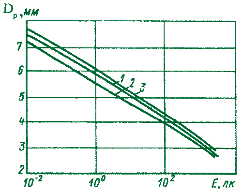 Рис. 7 – Зависимость диаметра зрачка глаза от освещенности на зрачке: 1 – эмметроп; 2 – гиперметроп; 3 – миоп Диаметр зрачка зависит от состояния аккомодации и конвергенции: усиление аккомодации и конвергенции влечет за собой сужение зрачка, их ослабление – расширение зрачка. Изменение возможно также при изменении только аккомодации или конвергенции. Это изменение особенно значительно при малых яркостях фона. Например, по данным Курве, при яркости фона 0,2 кд/м2 увеличение аккомодации от 0 до 7 дптр вызывает почти двукратное уменьшение размера зрачка: