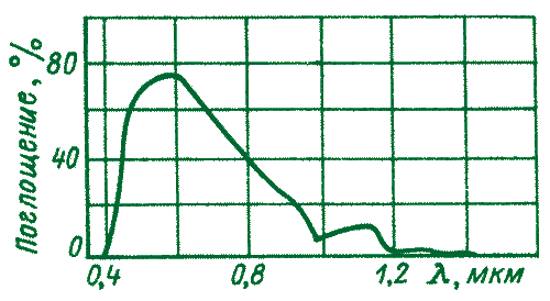 Рис. 12 – Суммарное поглощение прозрачными оптическими средами глаза При значительной интенсивности световое излучение может оказывать вредное влияние на глаз и тем большее, чем больше поглощение данного участка излучения в этой части глаза. К воздействию ультрафиолетовой части спектра более всего чувствительна роговица и хрусталик, к ближней инфракрасной части – хрусталик и водянистая влага. Ткани роговицы поглощают излучение с длиной волны менее 0,35 мкм и более 1,5 мкм. Интенсивное поглощение оптического излучения хрусталиком происходит в ближайшей ультрафиолетовой области спектра и в диапазоне от 0,9 до 1,4 мкм. Стекловидное тело прозрачно в видимой области спектра и поглощает в основном в инфракрасной области от 0,86 до 1,35 мкм [2]. Из рис.12 видно, что оптические среды глаза, поглощая часть падающего света в соответствии со своими спектральными характеристиками, значительно ослабляют падающее излучение, и сетчатки достигают в основном лучи видимой и ближней инфракрасной области спектра. Оболочки и структурные элементы сетчатки также по-разному взаимодействуют с лучами различных длин волн. Пигментный эпителий и хориодея, например, поглощают более 70% синезеленого излучения, а также достаточно эффективно красное (около 50%), что видно из рис.13.