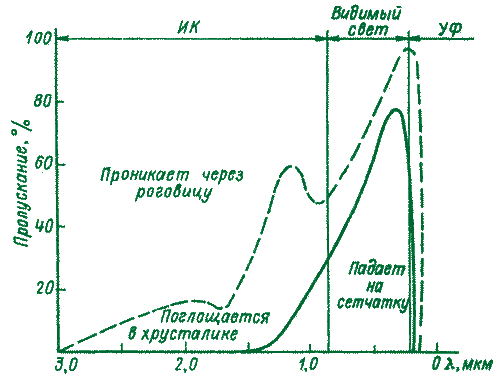 Суммарная кривая поглощения прозрачными оптическими средами глаза представлена на рис. 12. (Кривые на рис. 11 и 12 изображены с разрывом в видимой области спектра, поскольку поглощение оптическими средами глаза в этой области мало).