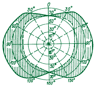 Различают: поле зрения неподвижного глаза, бинокулярное поле зрения и поле зрения с учетом возможности вращения глаз. Полем зрения неподвижного глаза называют пространство, которое одновременно видит глаз (или оба глаза), фиксируя определенную точку неподвижным взором при неподвижном положении головы. На рис. 16 сплошной линией, переходящей в штриховую, изображено поле зрения каждого из глаз: справа – правого, слева – левого. Белое поле, ограниченное штриховой линией, видимо обоими глазами одновременно, т.е. это бинокулярное поле зрения. Форма его близка к кругу, с диаметром около 70°. Каждый заштрихованный участок поля виден только одним глазом. Сплошная линия очерчивает пространство, одновременно охватываемое двумя глазами – все поле зрения обоих глаз.