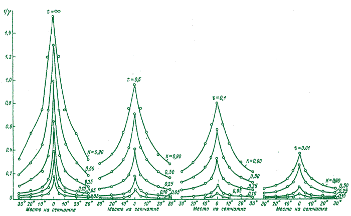 Рис. 19 – Зависимость остроты зрения от яркости фона К при различении темных объектов на светлом фоне