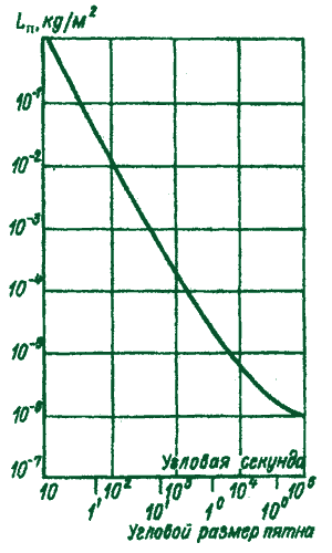 Рис. 22 – Зависимость пороговой яркости объекта L п от его углового размера Отдельные участки этой кривой можно аппроксимировать зависимостью: