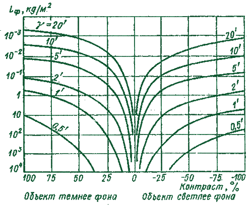 где L ф – яркость фона; Пороговое значение контраста обозначим К п. Значение К п зависит от углового размера объекта γ, яркости фона и времени наблюдения. На рис. 27 приведены зависимости порогового контраста К п объекта в виде диска от яркости фона для различных угловых размеров объекта при вероятности обнаружения Р = 0,5 [21].