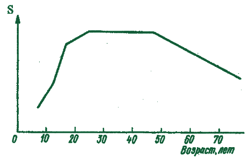 Рис. 28 – Зависимость предельного углового размера объекта от контраста и яркости фона Объекты темнее фона видны лучше, чем объекты светлее фона, различие в значениях контрастов составляет при этом 20%. Это соотношение справедливо как для фовеального так и периферического зрения. За минимальный пороговый контраст для объектов γ ≥ 60′ для практических расчетов при неограниченном времени наблюдения при вероятности Р = 1 принимают К п = 0,02. Опыты, проведенные в ГГО им. Воейкова, показали, что для обнаружения объектов на местности необходимым является более высокий контраст: К п = 0,035 – 0,04. Это значение соответствует случаю, когда местоположение объекта точно известно наблюдателю, т.е. когда глаз точно направлен на объект. Если местоположение объекта неизвестно, то значение порогового контраста будет зависеть от угловых размеров поля, в пределах которого следует его искать, от времени, отпущенного на его обнаружение, и от вероятности обнаружения [15]. Величина, обратная минимальному пороговому контрасту, называется контрастной чувствительностью S: S = 1/ К п. Максимальное значение контрастной чувствительности определяется предельно возможным пороговым контрастом с неограниченным угловым размером объекта в условиях оптимальной яркости L ≥ 350 кд/м2. На рис.29 представлена зависимость контрастной чувствительности от возраста наблюдателя [4]. Из графика видно, что контрастная чувствительность с возрастом повышается, достигает максимального значения в 25 лет, после чего идет на снижение. Ограничение времени наблюдателя менее 3 с вызывает увеличение порогов. Бинокулярная контрастная чувствительность выше монокулярной на 10% при центральном зрении и на 50% – при периферическом зрении.