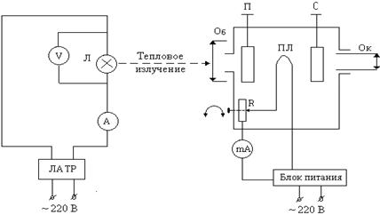 Изображение нити лампы накаливания Л с помощью объектива Об совмещается c изображением нити накала пирометрической лампы ПЛ. Оба изображения рассматриваются через окуляр ОК и светофильтр С, выделяющий из спектра обоих объектов излучение с длиной волны l = 660 нм. Регулируя внутренним реостатом R ток накала I2 пирометрической лампы ПЛ, добиваются слияния нити ПЛ на фоне раскаленной нити лампы накаливания Л. Затем по калибровочному графику и величине тока I2 находят яркостную температуру ТЯ нити ПЛ и, следовательно, нити лампы накаливания Л. Калибровочный график прилагается к лабораторной установке в виде графика зависимости температуры ТЯ нити ПЛ от величины ее тока накала I2 .