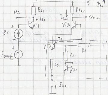Если поляр-ть вх. сигналов подав. на оба вх. один или совпад. по фазе то такие сигн.наз. синфазными. Диф. каскад позвол. решать задачу сравн. высок. точностью 2х вх. сигналов, или реш. задачу ↑ разности этих сигналов. При подаче на вх. один. полярности необходимо учит. появл. на Uвых1 и Uвых2 выход. синфаз. ош.. Эта ош. обусл. на обоих вх. одинак. пост. U = наим. U Uвх1 и Uвх2. Если Uвх1 > Uвх2, то Uвх2 м. р/м как синфаз, напр. Eсинф., кот. прилож. одновр. к обоим вх. усилит. Uвх1 - Uвх2 = eг, м/рассм. как диф. вх. U