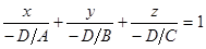 Уравнение плоскости в отрезках. Если плоскость пересекает все три координатные оси, но не проходит через начало координат, то её уравнение удобно записывать в специальной форме, называемой “уравнением в отрезках”. Зададим на каждой из координатных осей точку, отличную от начала координат, а именно: точку А(а,0,0), где а В качестве такого уравнения можно взять
