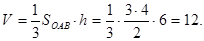 2. Найти объём пирамиды, ограниченной плоскостью, заданной в предыдущем примере, а также координатными плоскостями. За основание пирамиды можно принять треугольник с вершинами О(0,0,0), А(3,0,0), В(0,-4,0) в плоскости XOY;высотой пирамиды является отрезок ОС, где С(0,0,6). По формуле объёма пирамиды имеем