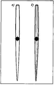 Чекан можно разделить (условно) на три основные части: 1) верхний конец чекана, 2) остов чекана, 3) нижний конец чекана (бой). Остов, как правило, делается восьмигранным, несколько утолщенный в средней части и зауженный к концам. Причем сечение восьмигранника должно быть прямоугольное, а не квадратное, и рабочая часть его соответственно направлена параллельно большей стороне прямоугольника. При таком сечении легче управлять чеканом, когда, не глядя на чекан, а только ощущая его, можно определить положение его рабочей части во время работы. В целом же такая форма обеспечивает большую устойчивость чекана и отсутствие вибраций. Кроме того, она соответствует размерам и форме человеческой руки. В зависимости от назначения различают следующие группы чеканов, имеющих различную форму боя. Канфарники — чеканы с заостренным рабочим концом в форме тупой иглы. На рис. 25 изображены два варианта канфарников: круглый (а) и восьмигранный (б). Канфарники служат для перевода рисунка с бумаги на металл, а также для отделки фонов точками. Изготовляют канфарник как слесарным способом (круглые), так и на токарном станке (восьмигранные). Проще канфарники изготовлять на станке, но восьмигранная форма удобнее в работе. Материалом может служить углеродистая сталь.