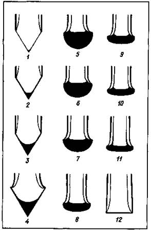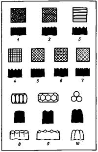 Чеканы с продолговатым, овальным, бобовидным боем называются облыми или бобошники («обло» — кругло, древнее русское слово). Это очень большая и разнообразная группа чеканов. Они так же, как и расходники, имеют самые разнообразные закругления рабочей части и размеры. Облые чеканы служат в основном для выколотки рельефа. Они имеют мягкую округленную форму рабочей части (рис. 28, а), и поэтому при выколотке рельефа из листового металла ими можно произвести наибольшую вытяжку рельефа. Изготовление облых чеканов в основном аналогично изготовлению расходников. Особое внимание нужно обратить на изготовление рабочей части. На ее поверхности не должно быть ломаных переходов. Как правило, общая форма облой части должна быть продолговатой, но не обязательно правильно овальной; она может быть и прямоугольной со скругленными углами. На рис. 28, б показаны разновидности форм рабочей части облого чекана, из которых видно, что ни на одной из приведенных форм нет острых углов. Все они смягчены, что необходимо при выколотке рельефа. Группа чеканов с более или менее плоским «боем» называется лощатниками (от глагола лощить). Применяются они для лощения (выравнивания) поверхности, для проработки рельефа с лицевой стороны, шрифтовых композиций, опускания фона и т. д. Лощатники бывают гладкие или шероховатые и соответственно след от них на металле получается гладкий, как бы кованый, или шероховатый (матовый) — мягкий. Рабочая часть гладкого лощатника должна быть несколько выпуклой с немного округленными углами по всему периметру рабочей части (рис. 29, а, б). Если же углы недостаточно округлены, то во время работы будут оставаться отпечатки рабочей части лощатника на обрабатываемой поверхности металла в виде лесенки, что нежелательно. Фоновые лощатники с матовой фактурой, как правило, бывают небольшого размера и с прямой плоскостью. Чеканы-лощатники с нанесенной на них фактурой не должны быть большого размера, если обрабатывается плоская поверхность, так как при большой площади опоры плохо передается фактура на обрабатываемый металл. Если же приходится обрабатывать выпуклую поверхность, можно брать фактурный лощатник и большего размера. Технология изготовления лощатников такая же, как и облых чеканов. Они могут быть (рис. 29, б) прямыми или с расширенной рабочей частью (рис. 29, а). Такая рабочая часть целесообразна для чеканов толщиной более 7 — 8 мм в средней части остова чекана. Это делается для удобства в работе, экономии материала и выбора более рационального способа изготовления. Следует добавить, что подобная форма рабочей части (для крупных чеканов) позволяет обрабатывать труднодоступные места и в некоторых случаях заменяют «сапожок». Начинающие чеканщики почти всегда делают ошибку при изготовлении подобных чеканов, делая слишком тонкую шейку и большую рабочую часть. «Шейкой» называется самая тонкая часть чекана в месте перехода рабочей части к остову. После закалки чекан с тонкой шейкой часто ломается после первых же ударов. Нормальное соотношение размеров шейки соответственно к длине и ширине рабочей части не должно превышать 1: 2, т. е. если шейка 6X7 мм, то рабочая часть будет приблизительно 12X14 мм (лучше меньше). Фактура на поверхность рабочей части лощатника может наноситься с помощью канфарника пурочника, острого расходника, трехгранно