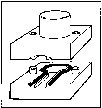 Закалку производить лучше сразу всего пуансона, а отпуск делать раздельный. Рабочую часть отпустить до появления соломенного цвета, а остальную, постепенно увеличивая к верхнему концу, до фиолетового и синего. На рис. 34, а изображен пуансон на дубовый лист. Он размещен параллельно длинным сторонам пуансона. Острозаточенные чеканы по форме такие же, как и расходники, с прямой и полукруглой рабочей частью, называются сечками (рис. 34, б, в). Они применяются для просекания фона ажурных чеканных работ из листа. Здесь следует указать на особенность заточки рабочей части сечки. Чтобы сечка нормально работала, ее надо заточить односторонне, как показано на рисунке, и ставить во время работы более прямой стороной к рисунку. В противном случае от наклонного положения сечки будет поднутряться контур просекаемого рисунка. Угол заточки должен быть небольшим, но с более наклонной стороны, у самой режущей кромки делается округление, чтобы сечку не заклинивало и ею можно было работать так же, как расходником, т. е. длинными ударами молотка. На рис. 34, б, в отмеченные цифрой 1 точки показывают рабочую сторону, которой сечка ставится к просекаемому рисунку. Все перечисленные виды чеканов различаются по размерам. Для мелких ювелирных работ употребляются чеканы, изготовленные из тонких стальных прутков сечением в 3 — 4 мм. Для работ средней величины применяются чеканы толщиной (в средней части) до 6 — 8 мм, при чеканке крупных декоративных композиций с большими формами, высоким рельефом толщина чекана может достигать 20 — 25 мм и больше. Крупные чеканы, т.е. толщиной 15 — 20 мм и больше, обычно делают несколько длиннее (более 170 мм), но по тем же принципам, что и средние. Изготовление чеканов, толщина которых более 7 — 8 мм, довольно трудоемко. Для облегчения делают кузнечный штамп хотя бы для рабочей части чеканов. Форма рабочей части крупных расходников, облых чеканов и лощатников довольно сложна и поэтому применение штампа здесь необходимо. На рис. 35 показан простейший вариант приспособления, на котором можно штамповать только рабочую часть чекана. Сначала изготовляют образец чекана и производят его термическую обработку. Затем изготовляют две стальные плиты (лучше из жаропрочной стали 5ХНМ) и, нагрев их до светло-красного каления, быстро кладут под пресс, а между плит — образец чекана. Сильным ударом пресса делают отпечаток чекана на верхней и нижней плите. После этого обе плиты (вместе с образцом) медленно охлаждают, потом разнимают обе половины и производят разметку под сверление для направляющих колонок на верхней плите и сверлят ее насквозь. Соединив с помощью образца обе плиты вместе, сверлят через отверстие в верхней плите нижнюю плиту, но сверлом меньшего диаметра, чем требуется под колонки. Малое сквозное отверстие будет служить для выколотки колонок. Затем сверлом большего диаметра вторично сверлят отверстия диаметром, равным диаметру колонок (но не насквозь) в нижней плите. Так как отпечаток образца получится не полным, необходимо после сверления отверстий плоскости плит, на которых образовалось углубление по форме чекана, минимально прострогать «как чисто». После этого граверным инструментом доводят глубину обеих половинок до нормы. В верхней плите в центре нарезают резьбу под хвостовик. Производят термическую обработку верхней и нижне