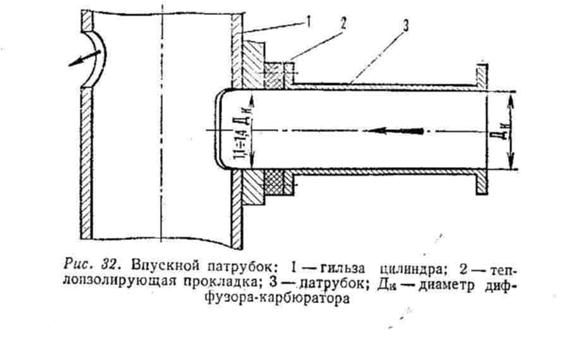 При изготовлении или подборе впускного патрубка (рис.32) следует помнить и выполнять ряд обязательных требований, которые в значительной степени влияют на мощность и нужный режим работы двигателя.