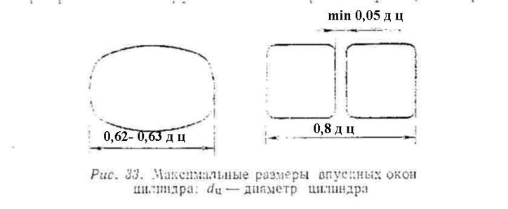 Длина впускного патрубка подбирается в зависимости от фазы газораспределения, диаметра диффузора карбюратора и предполагаемых максимальных оборотов двигателя. Основное правило: чем меньше фаза впуска и диаметр диффузора, тем короче впускной патрубок. Нужная длина впускного патрубка подбирается путем установки и подбора длины дистанционных вставок между карбюратором и цилиндром. Обычно при доводке двигателя на испытательном стенде для данного двигателя подбирается наилучшая длина впускного патрубка. А потом для подобных двигателей изготавливаются патрубки, по длине соответствующие подобранному на стенде. Эту работу можно произвести в обычных дорожных условиях методом засечки времени при прохождении прямого отрезка трассы. Правильно подобранная длина впускного патрубка дает возможность использовать резонансные явления газового потока, что повышает коэффициент наполнения цилиндра, т. е. использование давления столба воздуха во впускном патрубке. Замечено, что более длинный впускной патрубок улучшает работу двигателя на низких обооотах, а более короткий —лучше для больших оборотов. Для каждого двигателя нужно подобрать оптимальную длину впускного тракта (от зеркала цилиндра до конца насадки). Внутренняя поверхность патрубка чисто обрабатывается и полируется до блеска. На кроссовых мотоциклах желательно устанавливать впускной патрубок под прямым углом к оси цилиндра. Установка впускного патрубка под углом уменьшает эффективную площадь впускного окна. Например: при установке впускного патрубка под углом 45° F = 7,76 см х соs45° = 5,55 cм2, т. е. 70,6% от общей площади. Такое расположение впускного патрубка невыгодно, хотя и дает более плавный поток по сравнению с патрубком, расположенным под углом 90°. Иногда как исключение из-за конструктивных неудобств (низкая горловина картера и т. д.) приходится располагать впускной патрубок под некоторым углом к оси цилиндра. В этом случае всасывающее окно делают шире, сохраняя пропускную способность окна (рис. 33).