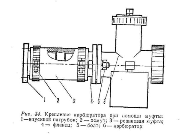 В случае использования бензомаслостойкого шланга между цилиндром и карбюратором, для уменьшения нагрева и вибрации карбюратора, следует обратить внимание на надежность закрепления шланга хомутами к патрубку и вставке карбюратора (рис. 34).