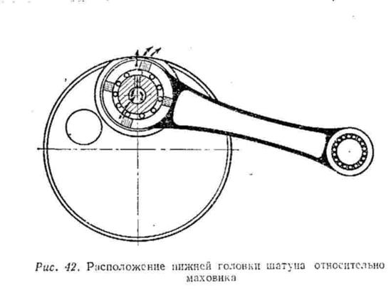 КОЛЕНЧАТЫЙ ВАЛ При имеющихся в настоящее время хороших маслах мазка из бензина с маслом является вполне удовлетворительной для соревнований по мотокроссу. Но важно помнить, что подшипнику нижней головки шатуна не хватает смазки, поэтому надо его смазывать как можно больше. С этой целью диаметр внутренних дисков маховика должен быть на уровне наружного диаметра нижней головки шатуна (рис. 42), т. е. максимально малый диаметр щек коленчатого вала.