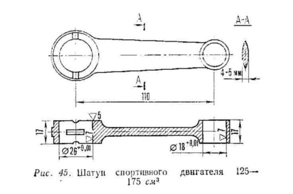 Если такой возможности нет, то следует сделать зазор между поршневым пальцем и втулкой верхней головки шатуна для диаметра пальца 14 мм — на 0,02—0,03 мм больше, а для Ø15—16 мм — на 0,03—0,04 мм. Не надо бояться стуков, на две гонки втулки хватит. При плотной втулке потеря мощности до 0,6 л. с. и возможен задир втулки, ее проворачивание. Шатун изготовляется обычно из стали 12ХНЗА, 18ХНВА или других сталей, обладающих нужными качествами (возможностью термообработки до НRс =59 — 63 ед.). Верхнюю и нижнюю головки шатуна калят и цементируют на глубину 0,8—1 мм с последующей шлифовкой и доводкой до нужной чистоты и размера. Остальная часть шатуна не калится, но обрабатывается до зеркального блеска (рис. 45).