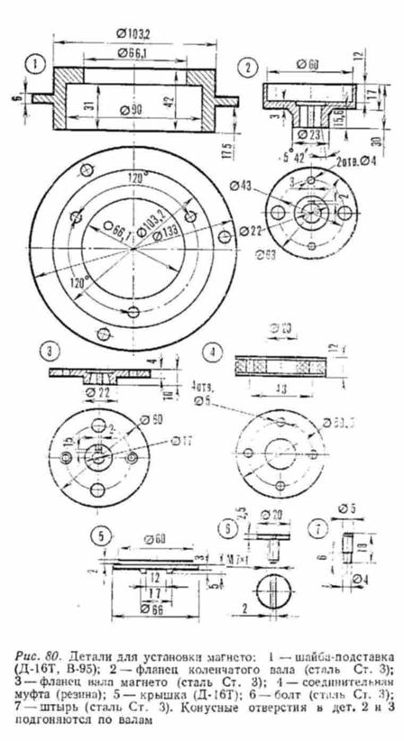 Чтобы обеспечить надежное зажигание и бесперебойную работу двигателя на всех режимах, обязательно установить на двигатель магнето. Простейшим способом установки магнето считается установка магнето без нарушений конструкции двигателя, т. е. не подрезая конуса коленчатого вала и не выпиливая окон в картере двигателя. Для этого изготовляется специальная шайба - подставка для крепления корпуса магнето М27Б и два переходных фланца (рис. 80).