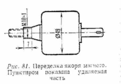 Передача вращения осуществляется через соединительную резиновую муфту в обойме. Якорь магнето вращается на собственных подшипниках, что обеспечивает постоянный разрыв на контактах прерывателя. Якорь переделывают согласно рис. 81.