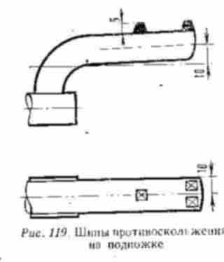 Выиграть зимний мотокросс — заветная цель каждого мотогонщика. Победа достается лишь сильному, умному, хорошо подготовленному к соревнованиям гонщику. Зимой — все главное, но все-таки ходовая часть и защита двигателя имеют первостепенное значение. Максимальная мощность двигателя на скользкой трассе почти не используется из-за постоянной пробусовки заднего колеса. Зимний мотокросс — всестороннее испытание для мотогонщика и его мотоцикла, и к нему надо быть готовым. Посадка гонщика на мотоцикле не должна отличаться от летней — она едина для любой погоды. При любом перемещении гонщика на мотоцикле ноги его должны твердо стоять на подножках. Подножки для зимнего мотокросса хорошо сделать откидными, короткими, с закругленными концами. Короткая подножка при езде на повороте и при движении по колее не цепляется, позволяет предельно наклонять мотоцикл. Закругленные концы подножки при возможных ударах не травмируют ноги. Слегка поднятые вверх концы подножек с шипами противоскольжения позволяют плотно стоять ноге. Малая площадь контакта подножки с подошвой ноги уменьшает возможность намерзания льда. Шипы навариваются электро или газосваркой, потом запиливаются под конус (рис. 119).