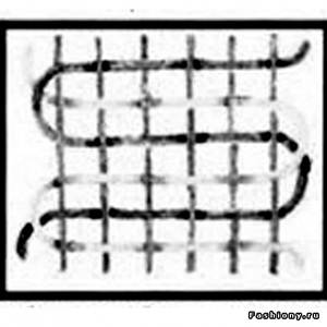 Затем, поворачивают верхнюю рейку ребром, поднимая тем самым нечетные нити основы, и ведут нить из утка назад. Опять набив нить вилкой, ведут нить в третий раз - в результате получается прямая полоса одного цвета. При этом нити основы становятся невидимыми как с лицевой, так и с изнаночной стороны. Таким образом полотняное переплетение образуется чередованием прокидок утка. Первая прокидка покрывает четные нити основы, вторая - не четные, и так далее. Нижний край ковра переплетается нитью одного цвета на 3-5 смв высоту. К нему прикрепляется рабочий чертеж - картон, на котором тонкими контурными линиями или в цвете сделан условный рисунок будущего ковра. В классических гобеленах сравнительно толстая, плотная основа и тонкая нить утков - они полностью покрывают основу и поверхность ковра получается однородно плотной и гладкой. Нетрадиционный подход позволяет разнообразить фактуру, которую получают, используя вместе либо различные материалы, либо различные техники ткачества. В этом случае подчеркнуто грубая и толстая основа употребляется с таким расчетом, чтобы в ковре виднелся и материал основы, придающей ткани своеобразную прелесть. Наряду с традиционными утковыми материалами - шелковыми и шерстяными нитями, употребляются также и другие естественные волокна (лен, кожа, хлопок, пакля, сисаль, манила, джут и т. д.), синтетические волокна, металлическая нить, полоски ткани, нарезанные полосками чулки и многое другое. Материал утка, вплетаемый между основой, может быть как одинаковой толщины, так и разной толщины. Некоторые поверхности - тонкоуточные, иные - гораздо грубее, гладкие поверхности могут чередоваться с ворсистыми; скромная матовая поверхность располагаться рядом с блестящей - из шелка или металла. В основу фактуры кладется несколько технических решений - разное плетение, чертежи узлов вывязывания, фактура нити. Виды гобеленовых плетений - Полотняное плетение (описанное выше). Современные мастера чаще всего пользуются именно этой техникой, позволяющей выплетать наиболее сложные композиции. -Саржевое плетение.
