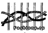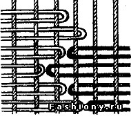 Создает фактуру в виде рельефных широких столбиков. Оттягиваем две нити основы и обворачиваем нить утка с изнаночной стороны наружу. Заводим на изнанку и выводим уже через две нити основы вперед. Снова обворачиваем и плетём далее. - Гиордес. Двойной симметричный узел (ковровый).