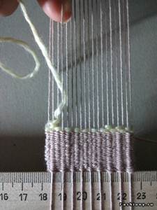 Первый ряд прокладываем слева на право полотняным способом. Затем оттягиваем нить основы и обворачиваем нитью утка с изнаночной стороны наружу. Заводим на изнанку и выводим уже к следующей нити основы и снова обворачиваем, уводим назад. Закончив ряд прокладываем один ряд полотняным. Затем заводим уток за нить основы и выводим через образовавшуюся петлю. Выполняем таким образом ряд. Снова прокладываем полотняным и всё повторяем со второго ряда. Также можно эту вязку выполнить заворачивая все время в одном направлении.