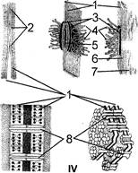 Рис. 26. Межклеточные соединения: I – плотное соединение, II – десмосома, III – полудесмосома, IV – нексус (щелевидное соединение); 1 – плазмалеммы смежных клеток; 2 – зоны слипания, 3 – электроноплотные пластинки, 4 – промежуточные филаменты (тонофиламенты), закрепленные в пластинке, 5 – межклеточные филаменты, 6 – базальная мембрана, 7 – подлежащая соединительная ткань, 8 – коннексоны, каждый из которых состоит из 6 субъединиц с цилиндрическим каналом (по А. Хэму и Д. Кормаку и по Б. Албертсу и соавт., с изменениями). Date: 2015-04-23; view: 1102; Нарушение авторских прав |