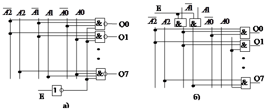 На рис. 3.2, а показан вариант построения разрешающего входа, когда сигнал Е воздействует непосредственно на все дешифрирующие ЛЭ. Этот вариант требует увеличения на единицу числа входов у дешифрирующих ЛЭ, но не вносит дополнительной задержки. На рис. 3.2, б показан другой вариант, основанный на том, что, как видно из рис. 3.1, б, в ДШ не найдется ни одного дешифрирующего ЛЭ, к которому любая переменная не была бы подключена или в своей прямой, или в инверсной форме. Поэтому если и в прямой, и в инверсной тракты любой входной переменной поставить элементы 2И и завести на них сигнал Е, то при Е=0 будут заперты абсолютно все коньюнкторы, подключенные к выходам. Такой способ экономичен по оборудованию, но увеличивает задержку дешифратора.