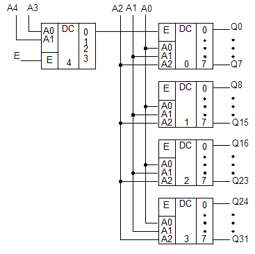 На рис. 3.3 показана группа из пяти ДШ, соединенных в два каскада. Вся группа работает как дешифратор "1 из 32". Два старших разряда адреса А4 и А3 расшифровываются дешифратором "1 из 4" DC4, который по входам Е управляет четырьмя дешифраторами "1 из 8" второго каскада. Младшие разряды адреса А2, А1, А1 поступают на все ДШ второго каскада, но выбранным по входу Е оказывается лишь один из них. Ему и будут принадлежать единственный из всех 32 активный выход. Так при поступлении кода А4А3А2А1А0=01111 у DC4 активный сигнал ("0") появится на выходе Q1, и по входу Е будет выбран DC1. Остальным дешифраторам второго каскада работа запрещена. Разряды адреса А2А1А0=101 вызовут появление активного сигнала на выходе Q7 DC1, т.е. на выходе Q15 всего составного ДШ, что соответствует заданному адресу. Принцип используется при построении ДШ на много выходов из микросхем ДШ с меньшим числом выходов. На рис. 3.4 показан двухкаскадный ДШ "1 из 16", второй каскад которого собран по схеме координатного или матричного ДШ. Разряды адреса разбиты на две группы.