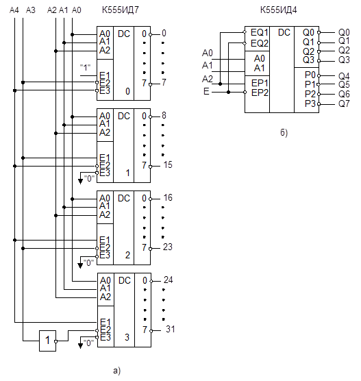 Рис. 3.5 Использование разрешающих входов микросхем дешифраторов а) – на разрешающих входах построена первая ступень каскадного ДШ; б) – универсальная микросхема дешифраторов 2x”1 из 4” и “1 из 8”.