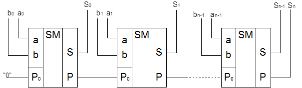 Обозначением полусумматора служат буквы НS (Нalf Sum). Его работа описывается уравнениями Процедуру сложения двух n – разрядных двоичных чисел можно представить следующим образом. Сложение цифр А0 и В0 младшего разряда дает бит суммы S0 и бит переноса P1. В следующем разряде производится сложение цифр А1, В1, и Р1, которое формирует бит суммы S1 и перенос Р2. Полный одноразрядный сумматор имеет три входа (рис.3.11,б): два для слагаемых А и В и один для сигнала переноса с предыдущего разряда. На рис. 3.12 показана схема, поясняющая принцип действия n- разрядного сумматора с последовательным переносом. Число сумматоров здесь равно числу разрядов. Выход переноса Р каждого сумматора соединен со входом переноса следующего, более старшего разряда. На входе переноса сумматора младших разрядов установлен “0”, так как сигнал переноса сюда не поступает.