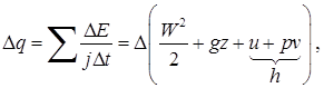 D E пот = g (z 2 – z 1) j D t, D E внут = (u 2 – u 1) j D t, –D E внеш = D W внеш = F 1D l 1– F 2D l 2 = (p 1 S 1)(W 1D t) – (p 2 S 2)(W 2D t) = –(p 2 v 2 – p 1 v 1) j D t. Величина D W внеш – работа внешних сил давления над газом за промежуток времени D t, заставляющих его двигаться. В идеальной жидкости (газе) через боковую поверхность трубки обмена механической энергии нет. Из баланса энергии для вещества между сечениями S 1 и S 2 находим выражение для подведенной теплоты D q ´ j D t после сокращения на величину j D t: