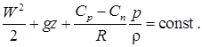 Отметим, что размерная постоянная в (2) определяется выбранной трубкой (линией) тока. Для разных линий тока значения постоянных в соотношении (2) могут, вообще говоря, меняться. Кроме того, const в первую очередь обозначает, что постоянная не зависит от координаты вдоль трубки тока, но она может зависеть от ряда физических параметров, определяющих процесс. После преобразований, учитывая соотношение n = (Cp – Cn)/(Cv – Cn), получим