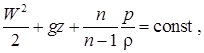 уравнение Бернулли для данного варианта. В случае адиабатического процесса n = k. Также просто описывается изобарический процесс n = 0. Случай несжимаемой жидкости r = const соответствует изохорному процессу n ® ¥. Из уравнения (2) находим