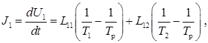 В данном случае dUj / dt – потоки Jj, а термодинамически сопряженные (см. (1)) величины (интенсивные переменные) образуют, как можно показать, силы (X 1,2 = (1/ T 1,2 – 1/ T p). Обратим внимание, что движущей силой теплопроводности является D(1/ T) а не обычно (эмпирически) используемая разность температур D T. Это фундаментальный вывод теории Онзагера, имеющий отношение и к другим движущим силам процессов переноса. Здесь L симметричная и положительно определенная матрица Lij = Lji. Два резервуара образуют изолированную систему. Поэтому, по закону сохранения энергии любая потеря энергии телом 1 должна в точности компенсироваться увеличением энергии тела 2, т.е. U 1 + U 2 = const и d(U 1 + U 2)/d t = 0. Следовательно, сумма правых частей уравнений (2) и (3) должна быть всегда равна нулю при любых T 1 и T 2. Так может быть только в том случае, если L 11 = – L 21 и L 22 = – L 12. Учитывая, что L 12 = L 21 – (соотношение симметрии), получаем L 11 = – L 21 = – L 12 = L 22 = L, где L – некоторая неотрицательная величина (это следует из условия Теперь уравнение (2) можно переписать так