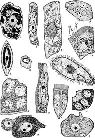 Рис. 49 Разнообразие формы митохондрнй в растительных и животных клетках (световой микроскоп): а — клетка водоросли спирогиры с палочковидными и нитевидными читохондрияыи; б — диатомовая водоросль; в — гифы гриба; г — сперматоцит нарцисса; д — плазмодий миксомицета; е -— инфузория-туфелька; ж — клетка медузы; з — клетки мальпигиевых трубочек паука; и—клетка эпителия кишечника насекомых; к—клетки эпителия глотки лягушки; л — клетки сосудистого сплетения акулы; м—клетки почки мыши; н — клетки мозга мыши; о—клетка спинального ганглия человека. Митохондрии открыл Р. Альтман (1890–1894 гг.). Сам термин «митохондрия» предложил К. Бенда (1897-1898 гг.); однако долгое время использовался термин «хондриосома». В 1920-ых гг. О. Варбург доказал, что с митохондриями связаны процессы клеточного дыхания. Строение и функции митохондрий были изучены лишь во второй половине ХХ в. с помощью биохимических и электронно-микроскопических методов. (рис. 50, 51)