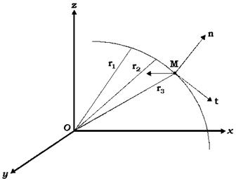 Западный метод познания природы начинается с того, что выбирается своеобразная "точка зрения" исследователя – система наблюдения или система отсчёта. В трёхмерном пространстве механики Ньютона система отсчёта представляет собой три взаимно перпендикулярных направленных отрезка прямой линии с общим началом О (см. рис. 1). Изучая, например, траекторию летящего камня, брошенного параллельно земле, наблюдатель измеряет в разные моменты времени расстояния от начала О до летящего камня М. В результате этого эксперимента наблюдатель получает набор расстояний r в каждый момент времени.