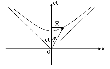 Пространство событий инерциальных систем отсчета механики Ньютона трехмерно и использует три пространственных координаты х, у и z. При движении систем отсчета эти координаты зависят от времени t, которое выступает в механике Ньютона как абсолютная величина. Представления о трехмерности пространства сохранялись в физике до тех пор, пока не начались эксперименты, связанные с распространением света. Было установлено, что свет распространяется со скоростью с = 300000 км/сек. При таких скоростях материи (или близких к ним, но меньших чем с) пространство событий становится четырехмерным, при этом время, умноженное на скорость света с образует четвертую координату Х0 = ct дополнительную к трем координатам х, у и z. В результате механику Ньютона заменила более совершенная релятивистская механика Эйнштейна-Лоренца. Геометрия пространства событий такой механики наделено структурой псевдоевклидовой геометрии. Это плоская геометрия, геодезические которой представляют собой четырехмерные прямые линии. По этим линиям движутся тела отсчета четырехмерных инерциальных систем. Название псевдоевклидова геометрия связано с тем, что четвертая координата х0 = ct выступает мнимой координатой по отношению к пространственным координатам х, у и z. Понятно, что четырехмерная инерциальная система отсчета является такой же идеализацией, как и трехмерная, поскольку, все тела отсчета хоть в какой-то степени взаимодействуют между собой. Из анализа уравнений релятивистской механики (т.е. механики больших скоростей) вытекают удивительные следствия. Во-первых, покоящееся тело отсчета обладает энергией покоя, равной произведению массы покоя m на квадрат скорости света: Е = mc2. Во-вторых, масса тела зависит от скорости движения и стремится к бесконечно большой величине при приближении скорости тела к скорости света. В третьих, всякое ускоренное поступательное движение в четырехмерном пространстве представляется как вращение в плоскостях, образованных осью времени ct и координатными осями х, у и z. На рис. 3 представлена одна из плоскостей, а именно, плоскость ct – х. На этой плоскости прямые, расположенные под углом к осям х и ct, представляют собой образующие светового конуса, по которым движется свет, естественно со скоростью света. Все тела отсчета, масса покоя которых m0 отлична от нуля, движутся внутри светового конуса, т.е. внутри сектора где расположена гиперболическая кривая.