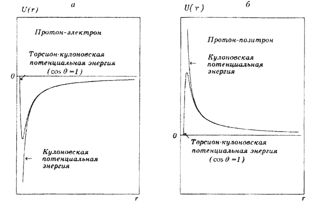 Рис. 27. Потенциальная энергия взаимодействия спинирующего протона, полученная из решения вакуумных уравнений: а) – электрона с протоном при | re |/ rs, б) – то же с позитроном.