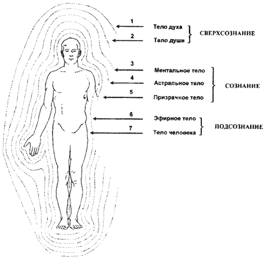 Согласно учению Сахаджа Йоги, в организме человека в районе копчика находится источник неиссякаемой «психической энергии» – Кундалини. У обычных людей Кундалини находится «в спящем состоянии», но во время медитации Кундалини активизируется и начинает подниматься по центральному энергетическому каналу вверх, проходя и заполняя последовательно энергетические центры – чакры. Каждой чакре соответствует свое «торсионное тело», создающее ауру человека. Поэтому, активизируя энергетические центры, Кундалини одновременно активизирует ауру. Чем выше поднимается Кундалини, тем более высокочастотный спектр торсионной ауры приходит в состояние повышенной активности. Считается, что чем выше активность тел человека, принадлежащая к тонким и высшим мирам, тем выше Сознание человека. Можно было бы (чисто условно) разделить Сознание на: подсознание, сознание и сверхсознание. Обычно Сознание человека связывают с мыслительным процессом, который проходит у него в голове. Это означает, что сознание человека локализовано в его голове и исчезает после его смерти. Однако более широкое представление о Сознании реальных систем вообще и более сложном устройстве человека в частности говорит нам, что здесь не все так просто. По свидетельству многих людей, побывавших в состоянии клинической смерти и вернувшихся к обычной жизни, высшая часть их Сознания отделялась от физического тела и, как бы со стороны, наблюдала за происходящими событиями. Было видно, например, как врачи пытаются вернуть физическое тело к жизни, а родственники скорбят о происходящих событиях. Эти данные свидетельствуют о том, что Сознание человека не локально и связано со структурой полевых тел человека (см. рис. 53).