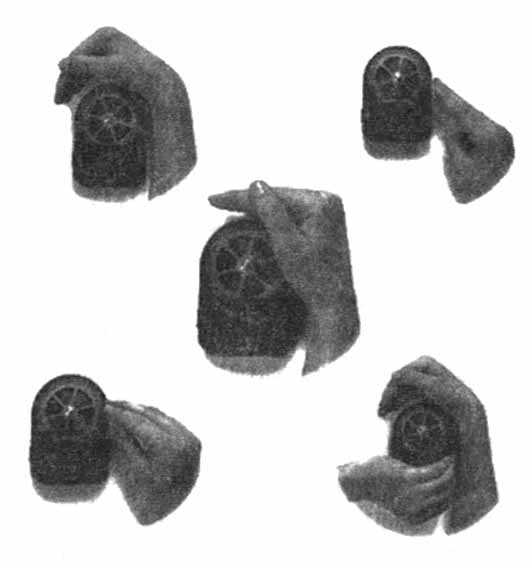 Основу этого прибора составляет тонкий металлический диск диаметром 10 см., центр которого покоится на острие иглы. Располагая на расстоянии 1-2 см. от края диска ладонь руки (см. рис. 55), можно усилием воли заставить диск вращаться по направлению вытянутых пальцев. Например, если приблизить к диску правую руку, то диск начинает вращаться против часовой стрелки. Воздействие на диск увеличивается, если использовать обе руки. Для этого надо направить вытянутые пальцы обеих рук в одну сторону (см. рис. 55). Необходимо отметить, что вращение диска происходит только тогда, когда оператор напрягает руку и старается усилием воли заставить колесо вращаться.