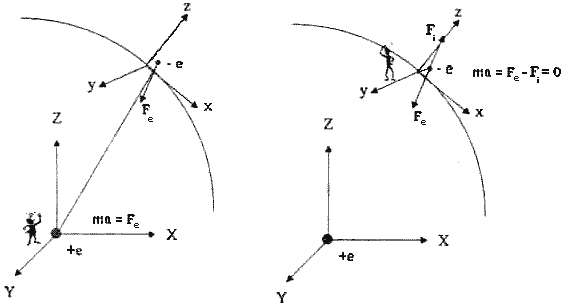 Рис. 7. Электрон - е движется по стационарной орбите вокруг ядра атома с зарядом +е. На левом рисунке наблюдатель видит движение электрона под действием внешней силы Fе На правом рисунке наблюдатель обнаружит в локально инерциальной системе прямолинейное и равномерное движение электрона. На рисунке 7а наблюдатель находится в инерциальной системе отсчета, связанной с атомным ядром, имеющим заряд +е. Измеряя относительные координаты своей системы отсчета и ускоренной системы, связанной с электроном -е массы m он видит, что электрон движется с ускорением под действием силы Fe.