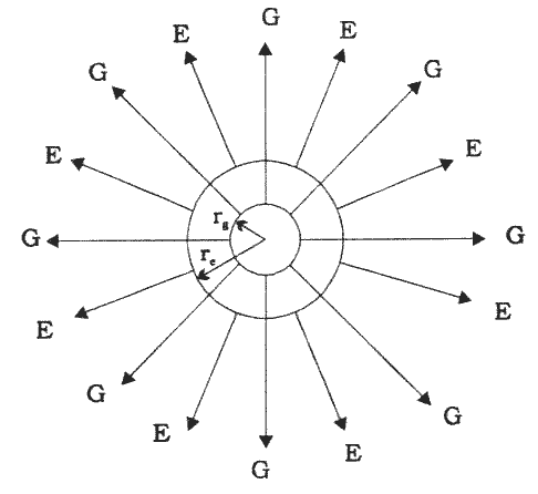 Рис. 24. Рожденная из вакуума сферически симметричная частица с массой и зарядом состоит из двух сфер с радиусами rg и re. Буквы G и Е обозначают статическое гравитационное и электромагнитное поля соответственно.