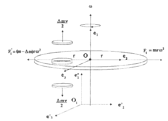 Рис. 45. Из однородного вращающегося гироскопа выбрасывается масса Dm, в результате чего силы инерции, действующие на центр масс, оказываются неуравновешенными. Вращающийся однородный диск представляет собой трехмерный гироскоп, поскольку вращение происходит в пространственных углах (и в данном случае используется один угол). Для того, чтобы перемещать центр масс трехмерного гироскопа за счет действия внутренних сил необходимо каждый раз выбрасывать массу и создавать таким образом не скомпенсированные силы инерции, действующие на его центр масс. Это напоминает разновидность реактивного движения, но только менее рациональное, чем существующее. F1 = (М + 2m)х '' б) проекция двух вращательных сил инерции на ось Х: F2 = - 2mrw2cosф - 2mrw ' sinф.