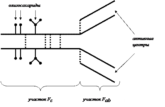 Рис. 54. Структурно-функциональными единицами антител. Антитела делятся на нормальные и иммунные. Например, у людей с 0 (I) группой крови, у которых отсутствуют антигены А и В, вырабатываются нормальные иммуноглобулины (агглютинины) a и b, которые относятся к классу IgM. Эти антитела не проходят через плаценту. При иммунизации таких людей антигенами А и В у них вырабатываются иммунные иммуноглобулины (изоантитела) a и b, которые относятся к классу IgA. Эти антитела проходят через плаценту и могут вызывать иммунологический конфликт между организмом матери и плодом. Гуморальный иммунитет и антитела в филогенезе впервые появляются у рыб. И только у плацентарных млекопитающих появляются все 5 классов антител. Однако клеточный иммунитет имеется и у высших беспозвоночных. У насекомых существует клетки–гематоциты, которые с помощью рецепторов распознают чужеродные антигены и блокируют их. С помощью этого механизма происходит изоляция личинок паразитов в теле насекомых. Структура антител очень изменчива. Поэтому существует несколько уровней их разнообразия: изотипы, аллотипа, идиотипы, вариотипы. Изотип – группа иммуноглобулинов данного класса, характерная для определенного вида организмов. Например, иммуноглобулин G кролика и иммуноглобулин G человека – разные изотипы иммуноглобулина G. Соответственно, иммуноглобулин G кролика является антигеном для человека и наоборот. Изотип определяется особенностями участка Fc. Аллотип – группа иммуноглобулина данного класса, характерная для определенной особи. Например, иммуноглобулин G у Иванова и иммуноглобулин G у Петрова – разные аллотипы иммуноглобулина G человека. Аллотип определяется генотипом особи. Идиотип – конкретные одинаковые молекулы иммуноглобулина данного класса, продуцируемые одним клоном клеток. В ходе дифференциации В–лимфоцитов каждая клетка приобретает способность синтезировать лишь один идиотип. Особенности идиотипа определяются строением вариабельных участков легкой и тяжелой цепей. Вариотип – группа иммуноглобулинов данного класса, отличающаяся от подобных групп последовательностью аминокислот, которая обычно консервативна (инвариантная последовательность). Таким образом, антитела обеспечивают образование самых разнообразных комплексов [антиген-антитело]. Антитела могут находиться в сыворотке крови (сывороточные антитела), но могут связываться своим Fc –участком с мембранами лимфоцитов. Такое связанное с мембраной антитело является рецептором антигена. В то же время на поверхности многих клеток имеются и рецепторы для Fc –участка антитела, Fc –рецепторы – гликолипопротеины или гликопротеины разнообразной структуры, встроенные в мембрану самых разнообразных клеток. Антигенными свойствами обладает не только гликокаликс, но и поверхность клеточных стенок, а также поверхность оболочек вирусов. У некоторых вирусов (герпеса, гриппа, ВИЧ и др.) образуется дополнительная оболочка из плазмалеммы клеток хозяина, что снижает антигенные свойства этих вирусов. При образовании комплексов [антиген-антитело] или [рецептор-белок] на поверхности клеток изменяется поверхностное натяжение плазмалеммы, что приводит к изменению физиологического состояния клетки.