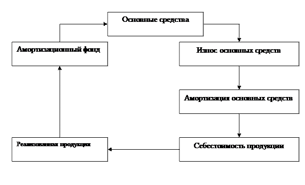 Норма амортизации каждого объекта основных средств и нематериальных активов рассчитывается как величина обратная нормативному сроку службы объекта. На основании «Положения о порядке начисления амортизации основных средств и нематериальных активов» (вступившего в силу с 1-го января 2002г.) нормы амортизации устанавливаются предприятиями самостоятельно в соответствии с диапазонными сроками полезного использования, которые приведены в данном документе. Например, по зданиям и сооружениям низкой капиталоёмкости срок полезного использования составляет от 5 до 15 лет, высокой капиталоёмкости от 50 до80 лет. Для машин, механизмов этот срок равен от5 до30 лет, а вычислительной техники – от 3 до 14 лет. В соответствии с этими сроками устанавливаются и диапазонные нормы амортизации. Срок службы – период, в течение которого объект основных средств или нематериальных активов сохраняет свои потребительские свойства. Нормативный срок службы устанавливается правовыми актами или на основе технической документации (технического паспорта на машины, механизмы, оборудования) и других документов. Начисление амортизации производится с первого числа месяца следующего за месяцем ввода объекта в эксплуатацию. На предприятиях амортизационные отчисления ежемесячно начисляются и включаются в себестоимость продукции. После реализации продукции образуется амортизационный фонд. Процесс амортизации и простого воспроизводства можно представить в виде следующей схемы (рис. 4.1):
