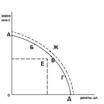Ресурсы – все то, что могло быть использовано в процессе производства. Классификация ресурсов: 1) природные (возобновимые, невозобновимые) 2) материальные (средства производства) 3) трудовые (рабочая сила) Факторы производства: 1) труд – зарплата 2) земля – рента 3) капитал – проценты 4) информация – доходы 5) предпринимательские способности – прибыль Закон замещения гласит: при полном использовании ресурсов и неизменной технологии увеличение производства одного продукта приводит к сокращению производства другого. Для получения каждой дополнительной единицы одного товара приходится расплачиваться потерей все возрастающего количества других товаров, т.е. увеличением упущенных возможностей. Кривая производственных возможностей — это кривая, показывающая различные комбинации максимальных объёмов производства нескольких (как правило, двух) товаров или услуг, которые могут быть созданы в условиях полной занятости при использовании всех имеющихся в экономике ресурсов.