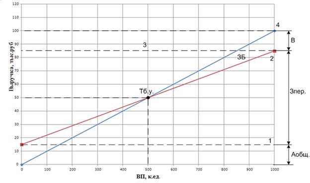1 – постоянные затраты; 2 – переменные затраты; 3 – полные затраты (строятся параллельно объему производства); 4 – линия выручки;