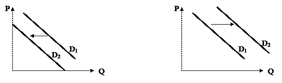 Рис.6 Уменьшение спроса Рис.7 Увеличение спроса Реакция спроса на изменение каких-либо факторов характеризуется эластичностью спроса, для измерения служат коэффициенты эластичности. Выделяют три вида эластичности: ü эластичность спроса по цене (ценовая эластичность) – ü перекрестная эластичность ü эластичность спроса по доходу Коэффициент эластичность спроса по цене