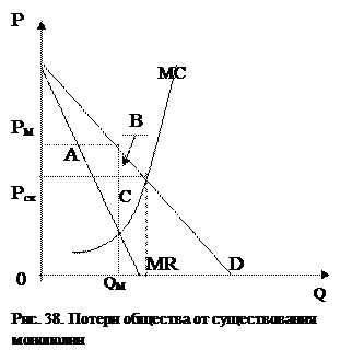 Условием равновесия монополиста, максимизирующего прибыль, является равенство предельного дохода и предельных издержек: MR = MC (см. рис.37). Но при этом его цена будет больше предельного дохода, а значит и предельных издержек: P>MR = MC. Благодаря этому монополист получает монопольную ренту или сверхприбыль, источником которой потребительский излишек.